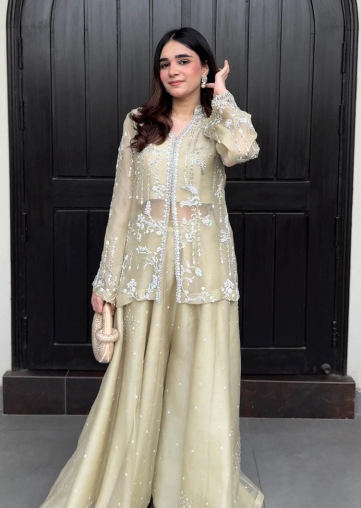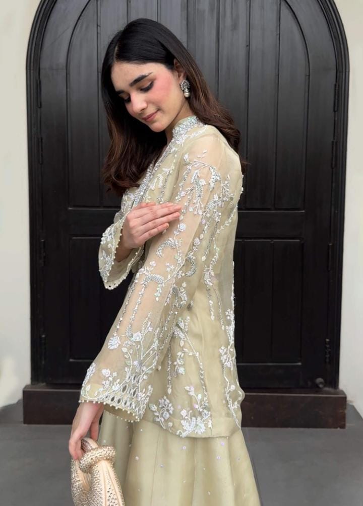 Fresh, Chic and effortessly elegant — Alisha is a short, stylish jacket in an ethereal kiwi mint hue that feels like a breath of spring. Crafted from the softest pure organza from the jacket to the graceful flared pants also made from pure organza for the dreamiest feel. Intricate heandwork of sequin, katdaana and dabka grace this outfit. Alisha is perfect for fashion-forward celebrations.