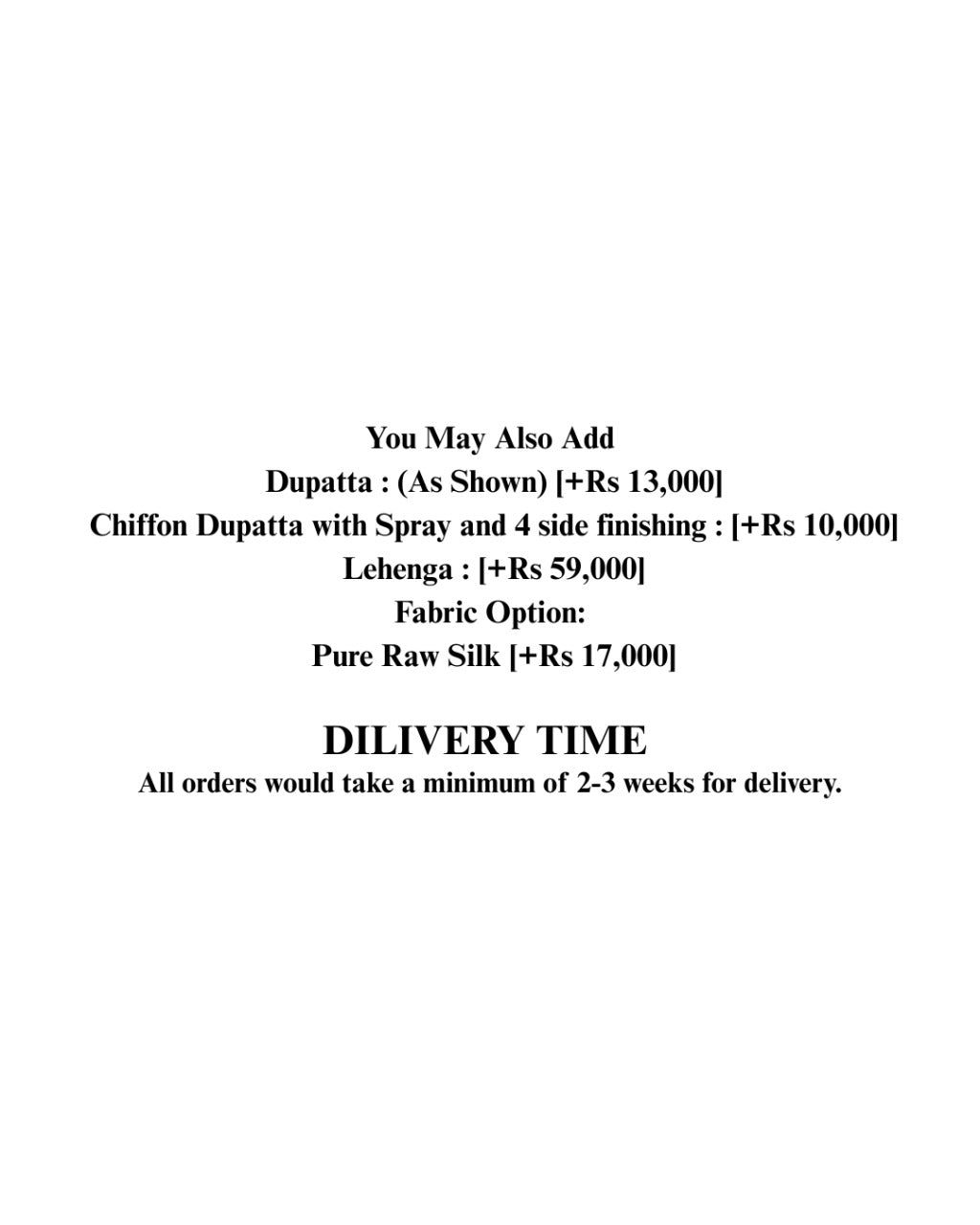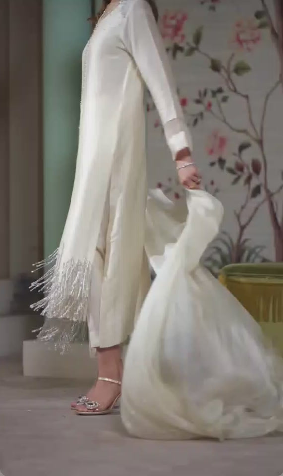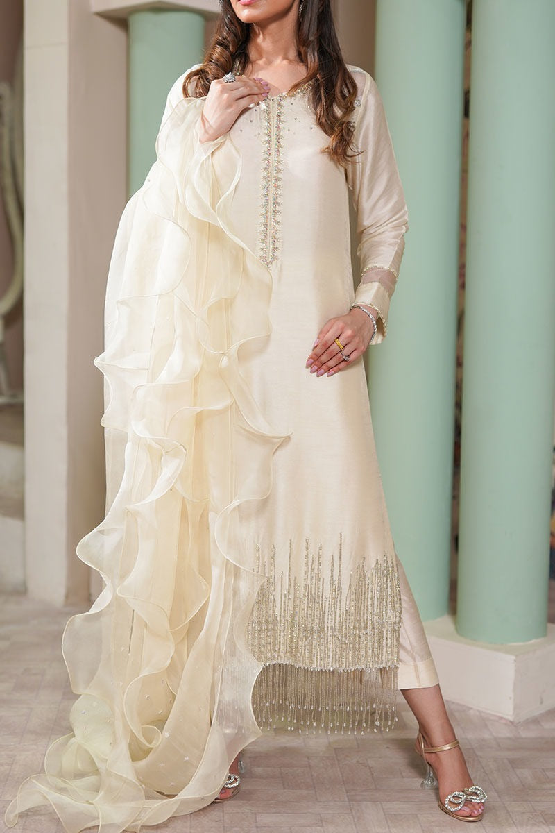 Embrace sophistication with a silk shirt featuring a hand-embellished neckline and daman fringe. Complete the look with an organza frill dupatta adorned with hand-embellishment throughout. Pair it with a plain silk pants for a classic touch or opt for a pure medium silk crush lehnga that exudes elegance and grace.